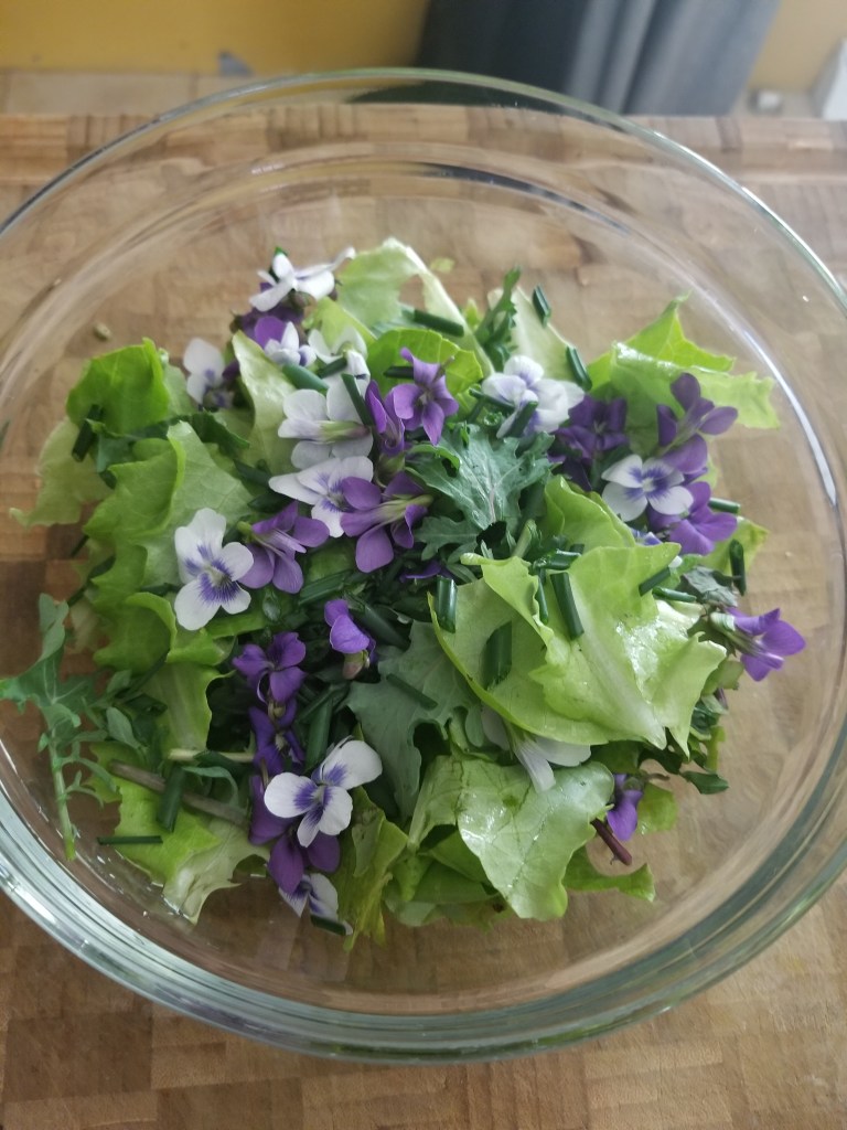 Spring salad with homegrown kale, two types of lettuce, walking onion greens, and violets.