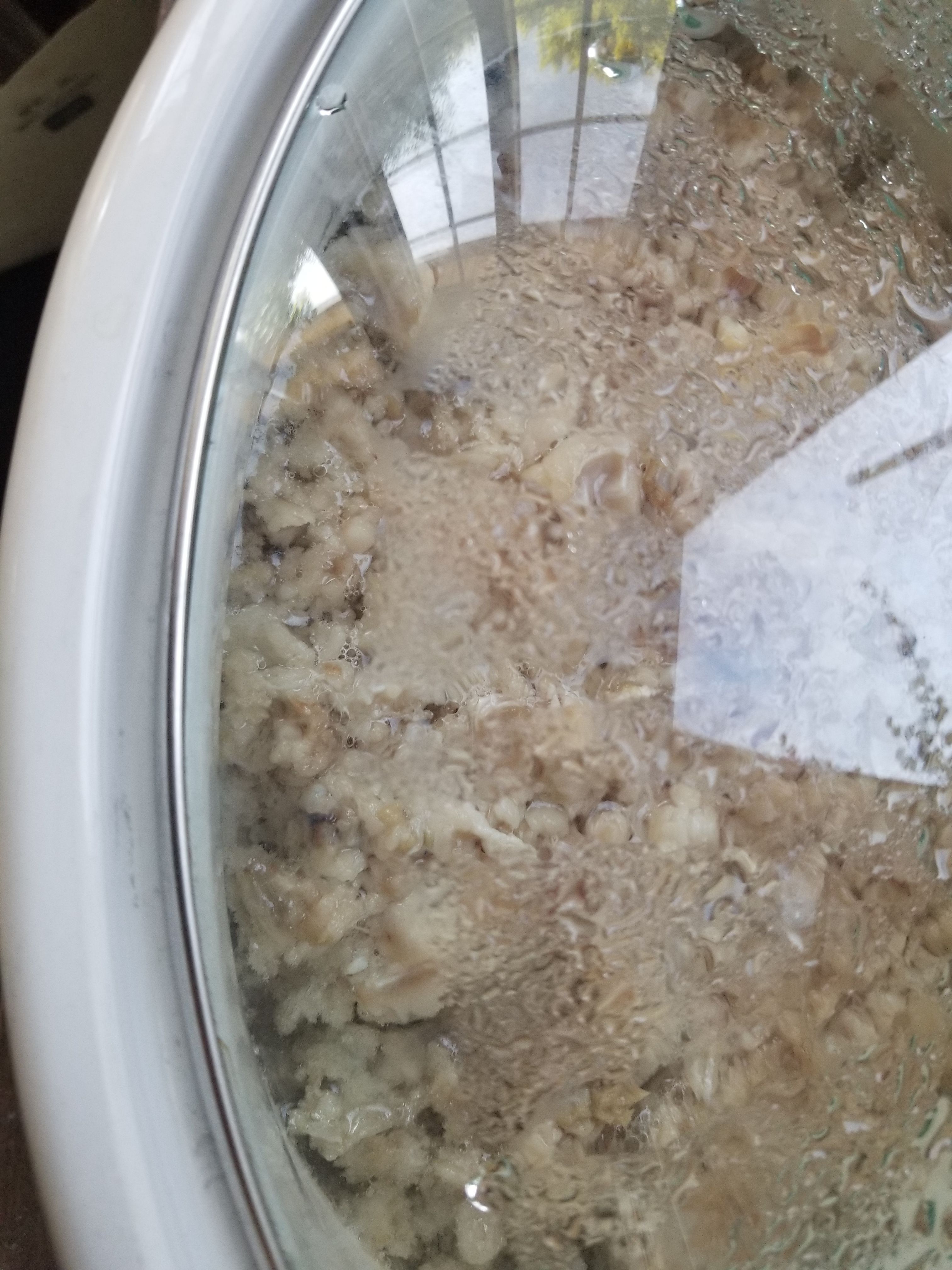The layers began with sliced, raw tomato, followed by the seasoned, cooked lamb and onions, which was pressed down as tightly as possible. The next layer was the vegetable medley; I used zucchini, green bell pepper, and cauliflower. Again, this is mashed into place, by hand, as densely as possible. The final layer is the rinsed rice. After this is mashed down, the hot stock is poured ever so delicately, sometimes using a plate to disperse the stream. Then you put the lid on the dutch oven, turn the heat on low, simmer for 45 minutes and hope for the best.