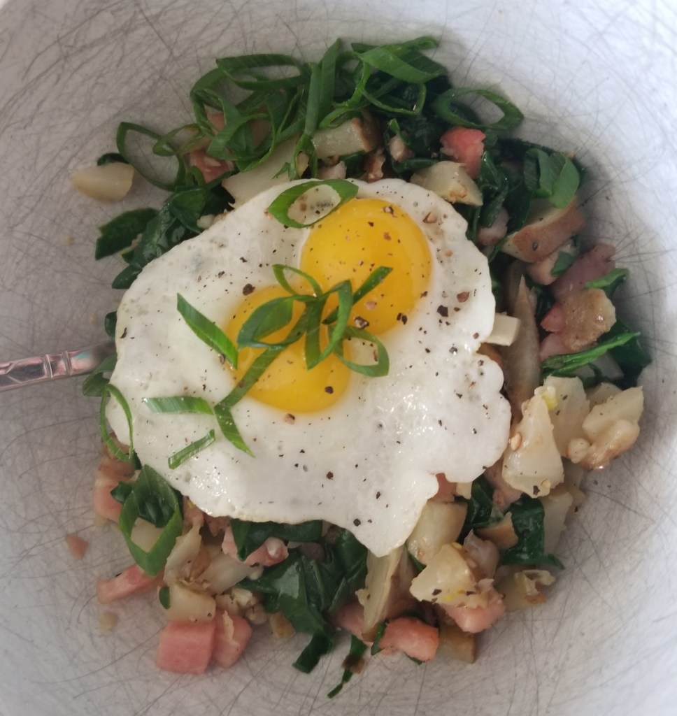 - 1 bunch kale, rinsed, stems discarded, leaves diced
