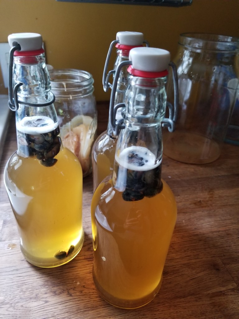 Not one to give up so easily, I brewed a second batch. I scaled up to a half gallon to provide myself the opportunity to experiment further. Knowing that I have had second fermentations fall flat if the booch is too far along (not enough sugar to feed the yeast) or without the addition of fruit (sugar), I went with an old standby.