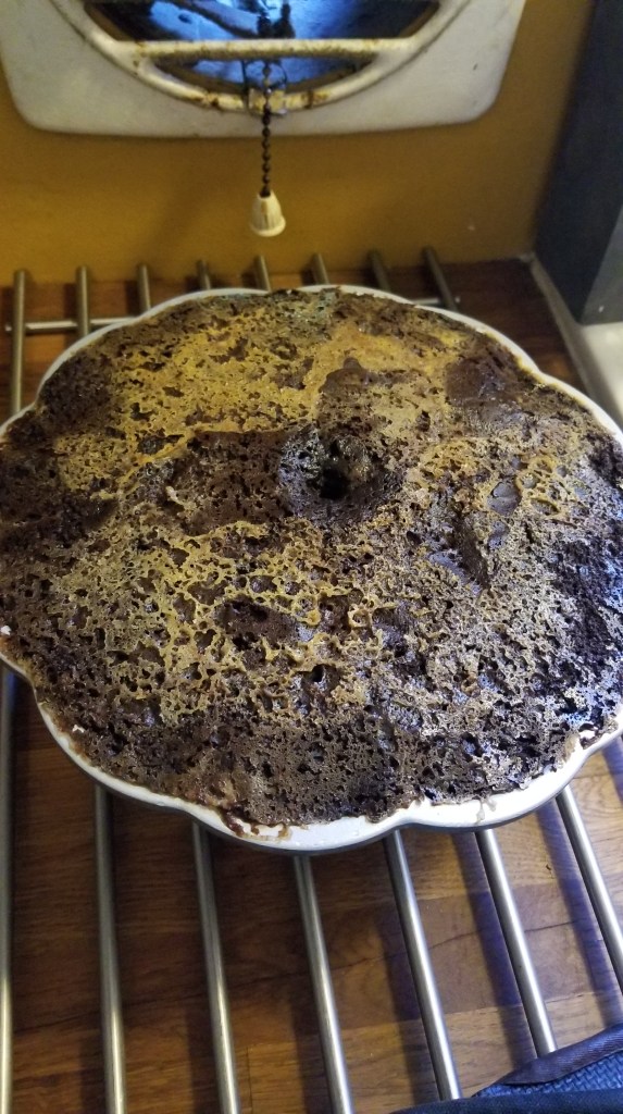 You’re cooking this bubbling monstrosity until it turns “amber colored”. Don’t walk away. And have your pie tin handy and at least room temp. You may want to put it in the oven for a minute or two if your house is as cold as mine (65°F in the kitchen!).