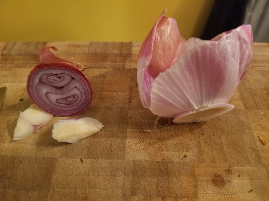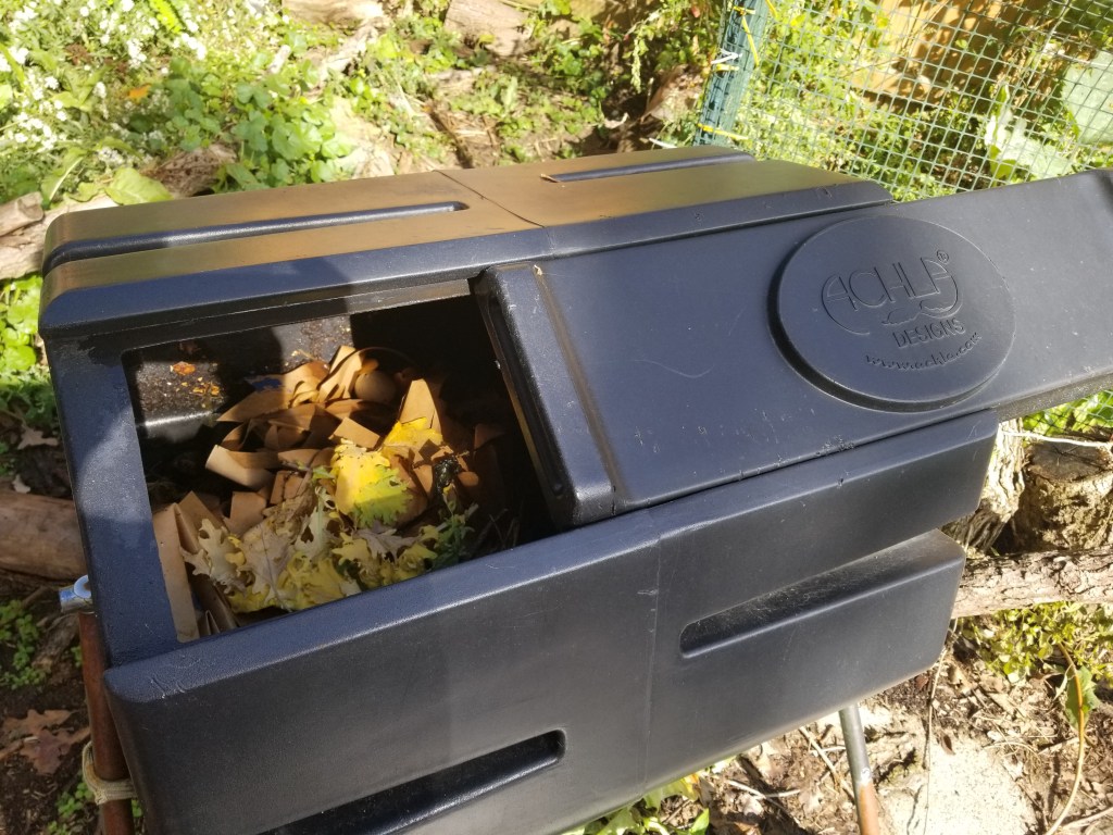 - Compost. Sort of. Produce scraps that don’t go for stock (stems, especially nightshade; rotten bits; moldy, stinky, or slimy), egg shells, and paper bags are the most common items I try to compost. The compost piles are fenced to keep the dogs out, but I have learned that if I put even the most unrecognizable lettuce leaf in, the possums come swarming, then the dogs try to eat the possums… it’s a mess. That means kitchen waste must go in the compost tumbler. The stinky, heavy, unruly compost tumbler that probably should have been emptied years ago and a few times since. I want to be better at composting kitchen scraps (yard waste is easy, just throw it in a pile), but it is admittedly low on my radar. Maybe I should invest in backyard chickens…